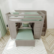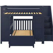 Study and storage now in a stylish package. The Buxton 4 Loft Bed handles it all in one beautiful setup. This bed's unique design has a freestanding lower bed that can be moved for ultimate versatility. The desk with two drawers is the perfect place for studying and storing your school essentials. An included storage tower with extra-long drawers organizes your clothes, books, and bedding. A wide, anti-slip staircase makes climbing up simple and easy. The staircase also features built-in storage for your shoes and other everyday items. Safety and security come standard with tall 15" guard rails for the top bunk. Crafted with solid, knot-free New Zealand pine wood and metal-on-metal connections, this bed offers strong support for years to come. The durable, non-toxic low VOC finishes make this bed the clean and healthy choice for your home. A slatted headboard and flush, color-matched hardware create a modern look. Combining superior quality with classic design, this Loft with Staircase + Desk + Storage + Lower Bed is the perfect all-in-one solution for every room.