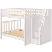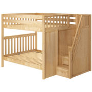 With 3.5 ft of space between top and bottom, our high bunk bed ensures no more bumped heads! Queen size = extra room for growing kids, or adult overnight guests. Stairs are a safe way for young children to climb into bed + sturdy enough for grown ups. Added bonus – steps double as storage drawers.