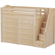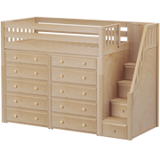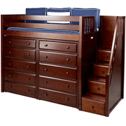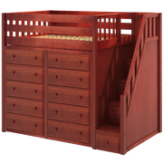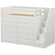 Our best-selling high loft bed becomes the ultimate storage cube. Matching dressers slide in perfectly beneath the bed, saving valuable floorspace. Added bonus, super safe staircase steps double as storage drawers.