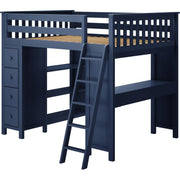 Made to store all your essentials, the Mayfair Loft Bed is the ideal sleep, study solution for your space. A desk with two drawers offers the perfect place for studying. Made to be both stylish and versatile, this desk can be assembled on either side of the bed for the ultimate space-saving design. Safety comes standard with extra tall 15" guardrails. Storage is made simple thanks to a storage tower with extra-long shelves. The reversible ladder with rounded edges and grooved treads makes climbing up easy and comfortable. This loft bed's raised design maximizes your space by opening up room underneath for an additional storage or lounge area. Crafted with solid, knot-free New Zealand pine wood and strong metal-on-metal connections, this bed's frame offers sturdy support for years to come. Feel safe and secure with solid plywood slats and a metal support bar that offer a high 400 lb. resting weight capacity per sleeping surface. The beautiful slatted headboard and flush, color-matched hardware create a modern look. Durable, non-toxic low VOC finishes make this bed the clean, healthy choice for your home. Combining superior quality with classic design, this Loft with Desk + Storage is the perfect all-in-one choice for every room.