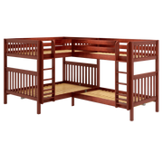 We combined two bunk beds to form an "L" shape that fits perfectly in a bedroom corner. Designed as a space-saving way to sleep four, it’s the perfect solution for a shared bedroom or vacation home. Easy-to-climb, solid wood ladders on each end for dual access points. Patented Rock Lock system keeps stacked beds super sturdy + secure.