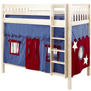 We added adorable curtains to our high bunk bed with straight ladder for a playful take on this Maxtrix classic! 3.5 ft of space between top and bottom allows taller kids + adults to sit up comfortably. Two twin beds are stacked using patented Rock Lock system to form one solid unit.