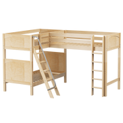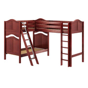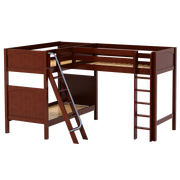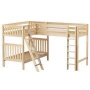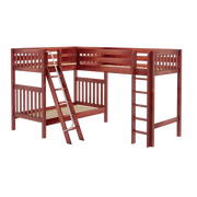 Our high corner loft bunk is just that – two beds stacked on one side connected to a single raised bed on the other. The result is a super functional “L” shape that fits perfectly in your bedroom corner.