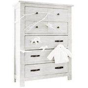 Milk Street’s Relic Tall Chest / 5-drawer dresser boasts thick, chunky posts, rustic luxury and optimal function. Transitional. Gender neutral. Filled with features for optimal function. Its organic, distressed finish and unique, metal hardware add the perfect details to this versatile piece; complete with top drawer dividers for added organization!