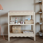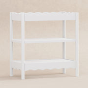 With rounded posts and wave-like edges, the Swell Changing Table has a modern appeal with an ocean-inspired design that pairs perfectly with your Swell Crib. It features two spacious, open shelves to keep all your baby’s diaper changing needs within easy reach for convenient changings.
