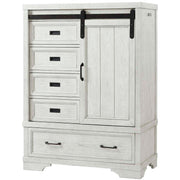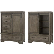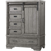 The Foundry Chifforobe adds stylish storage space to the Foundry Collection, featuring a sliding door, 5 drawers & adjustable shelving.